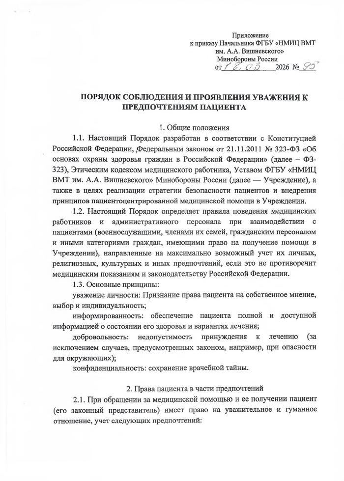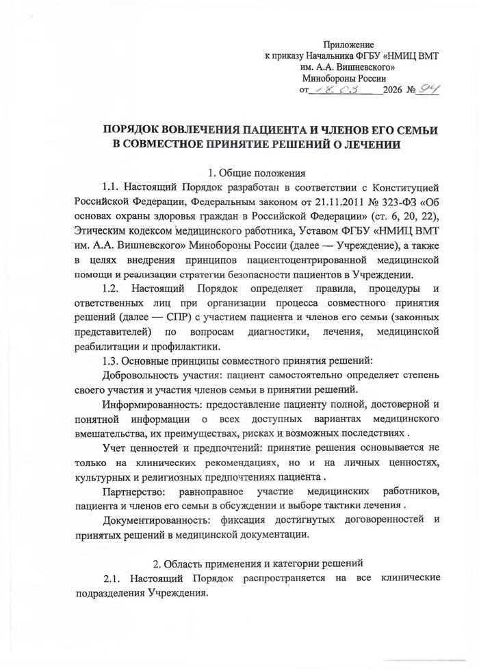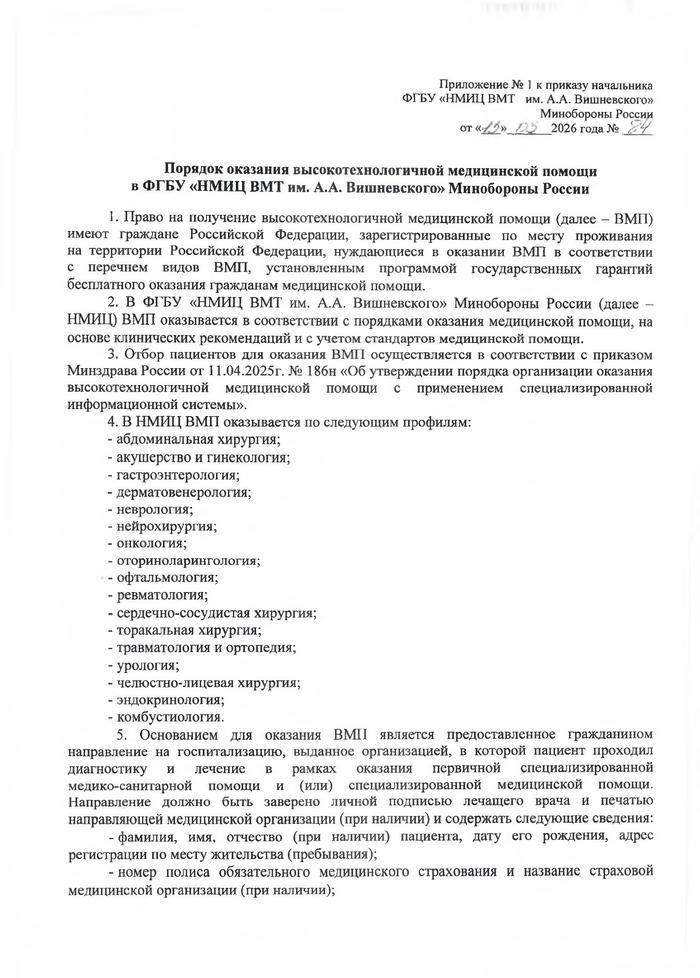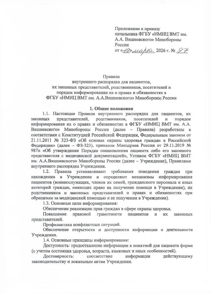 Приложение к Приказу начальника ФГБУ НМИЦ ВМТ им. А.А. Вишневского Минобороны России
