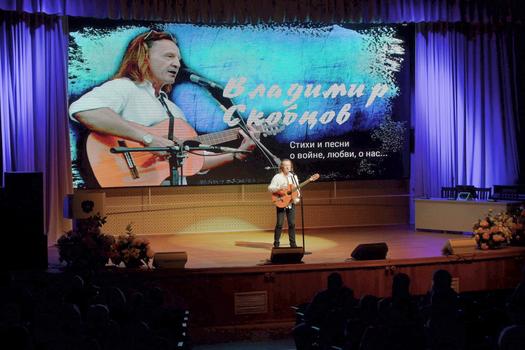 На сцене клуба НМИЦ ВМТ им. А.А. Вишневского МО РФ выступил известный исполнитель авторской песни, прозаик, поэт, член Союза писателей ДНР, член Союза писателей России, один из соавторов сборника гражданской поэзии Донбасса “Час мужества”, автор неофициального гимна Донбасса “Донбасс за нами” Владимир Скобцов.