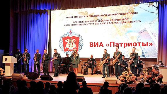 На сцене клуба НМИЦ ВМТ им. А.А. Вишневского МО РФ в рамках поддержки воинов - участников СВО выступил вокально-инструментальный ансамбль “Патриоты” Военного института (военных дирижёров) Военного университета имени князя Александра Невского МО РФ.