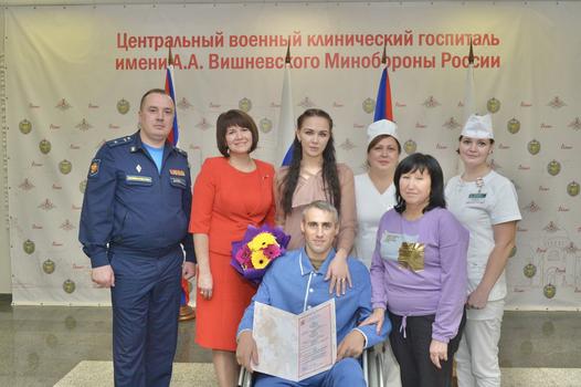 В стенах НМИЦ ВМТ имени А. А. Вишневского вновь прозвучал марш Мендельсона. Участник СВО, находящийся на излечении в госпитале, сделал предложение своей любимой женщине – матери его детей. Сотрудники отдела ЗАГС по городскому округу Истра главного управления ЗАГС Московской области провели торжественную церемонию бракосочетания прямо на территории военного медицинского учреждения и тем самым узаконили право жены ухаживать за раненым мужем.