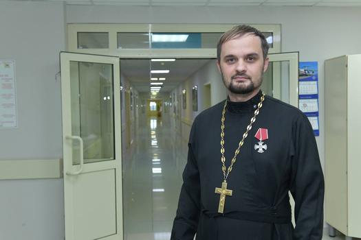 Государственную награду герою с православными крестами на петличных знаках вручили в НМИЦ ВМТ имени А.А. Вишневского, где полковой священник проходит лечение после ранения под Мариуполем.