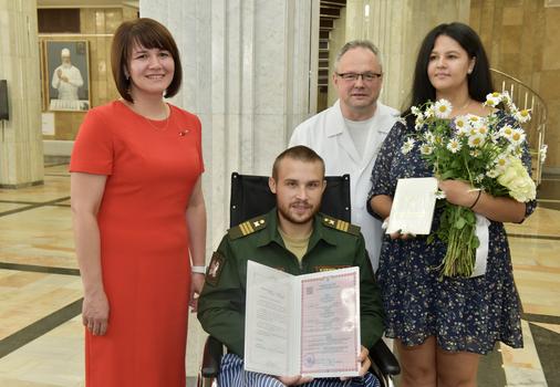 В НМИЦ ВМТ имени А.А. Вишневского впервые состоялась торжественная церемония бракосочетания. Военнослужащий – участник спецоперации по защите Луганской и Донецкой областей, находящийся в госпитале на излечении и медицинской реабилитации, создал семью не дожидаясь выписки из учреждения. Военная форма заменила свадебный фрак, а фойе главного корпуса – ЗАГС.