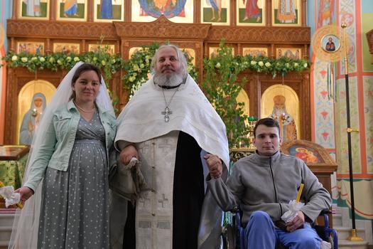 В Храме святителя Луки Симферопольского, расположенном на территории НМИЦ ВМТ им. А.А. Вишневского МО РФ, в День Святой Троицы состоялось первое в этих стенах таинство венчания.