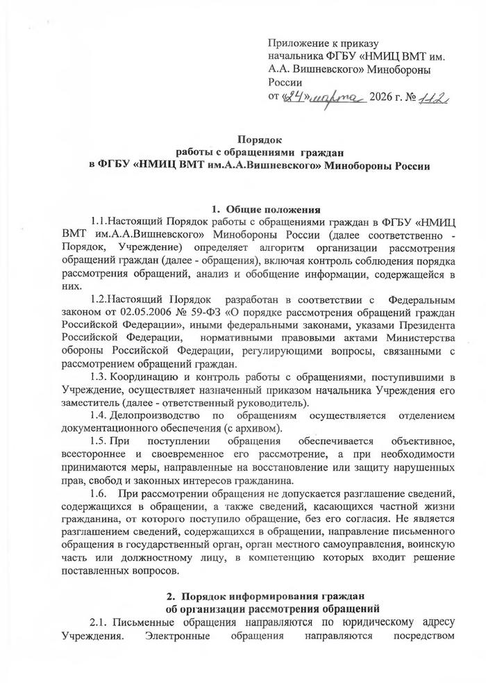 Порядок работы с обращениями граждан в ФГБУ НМИЦ ВМТ им.А.А.Вишневского Минобороны России