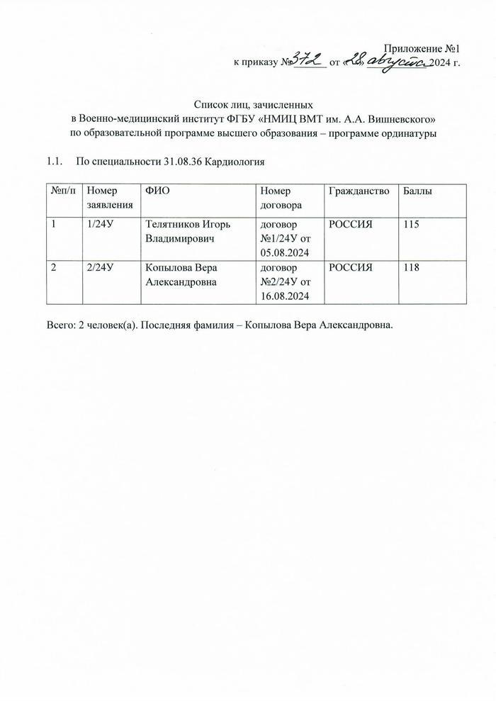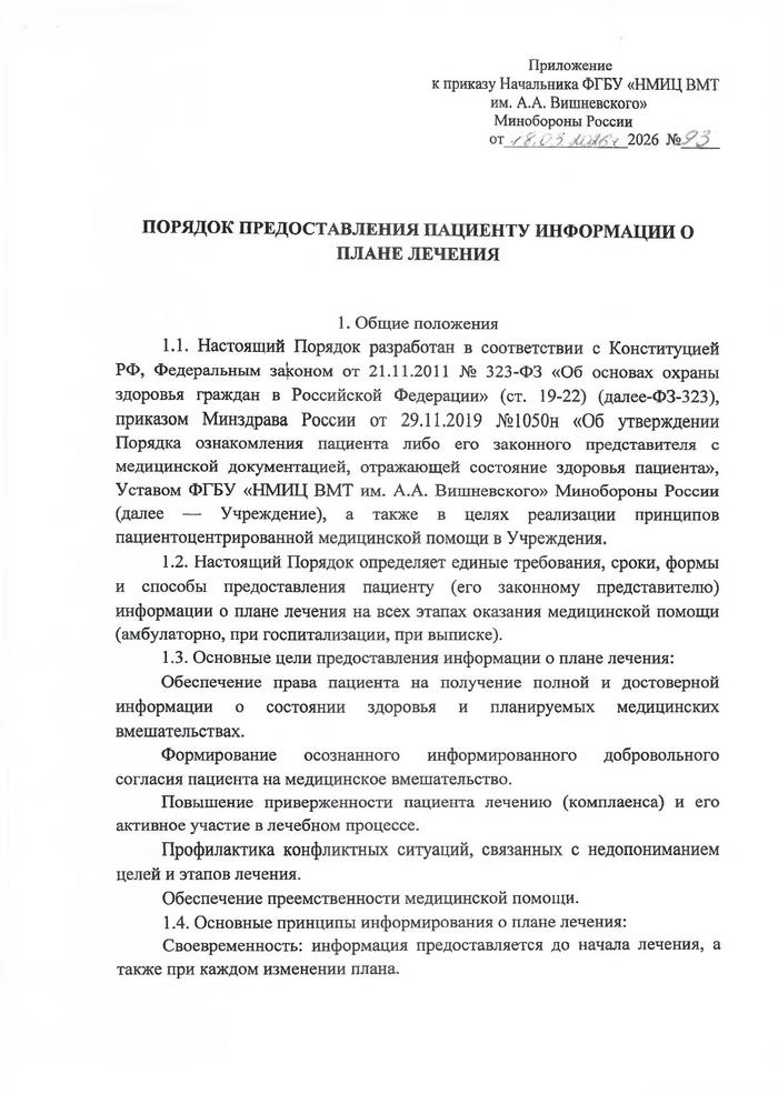 Приложение к Приказу начальника ФГБУ НМИЦ ВМТ им. А.А. Вишневского Минобороны России