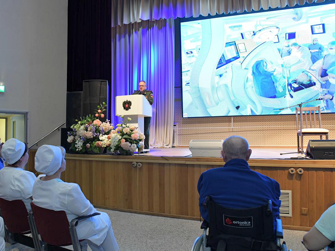 Начальник НМИЦ ВМТ им. А. А. Вишневского МО РФ, генерал-майор медицинской службы, доктор медицинских наук, Заслуженный врач РФ, действительный член Академии военных наук Александр Владимирович ЕСИПОВ со сцены клуба поздравил сотрудников Центра с их профессиональным праздником - Днём медицинского работника.