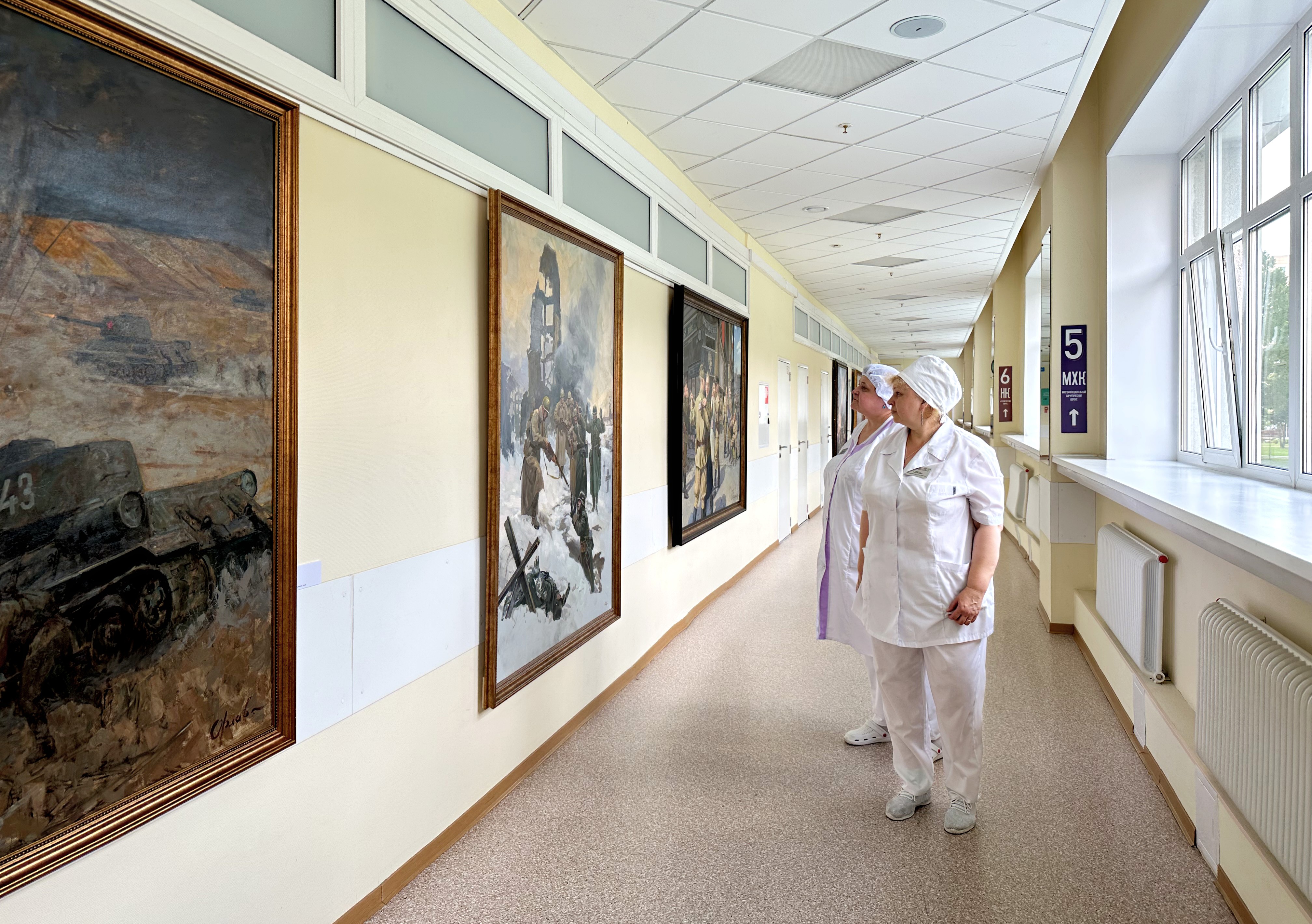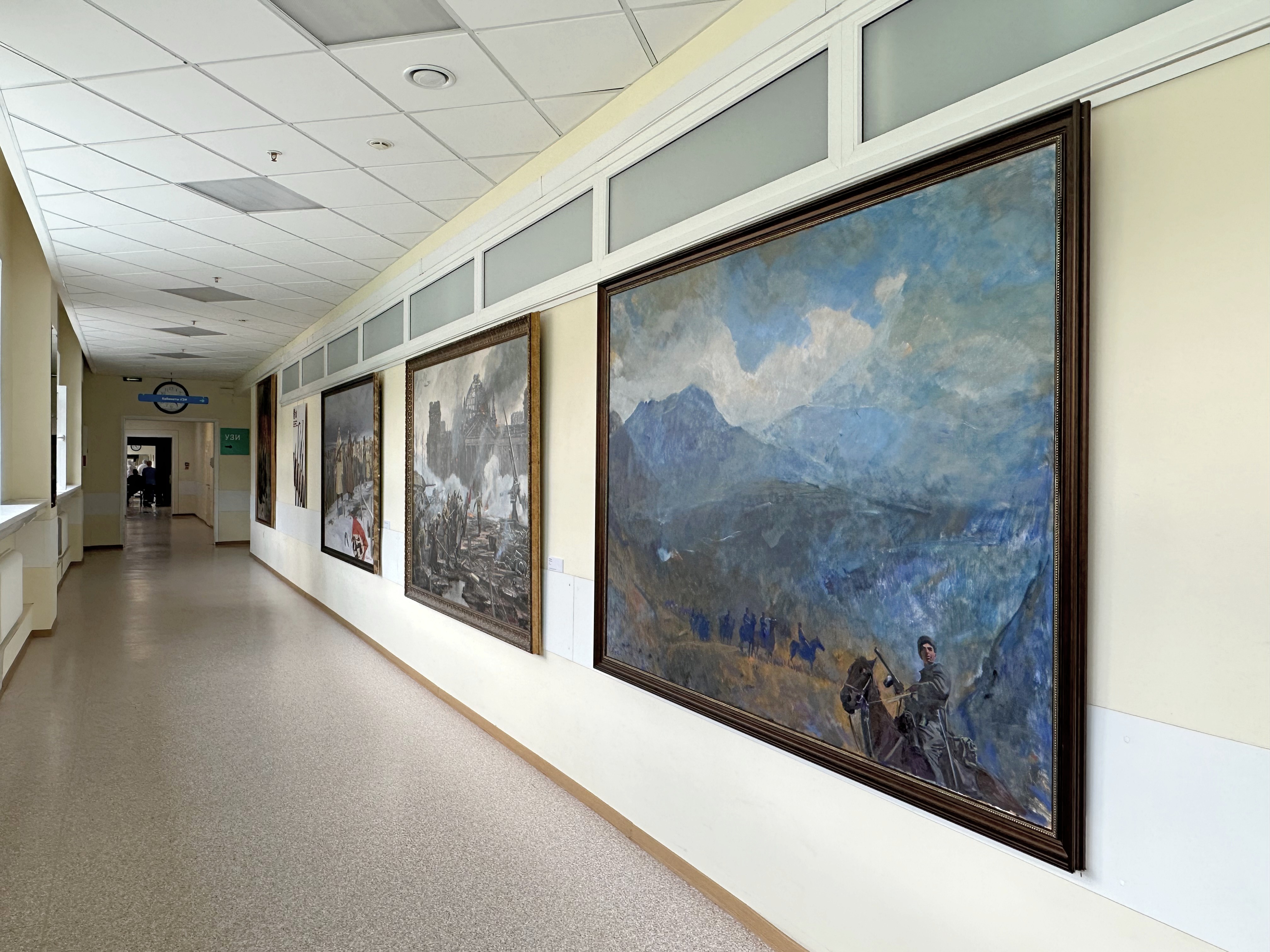 Талантливые и яркие работы мастеров нашли свое место в длинном и хорошо освещенном в любое время суток коридоре, соединяющем два госпитальных корпуса. Теперь, по признанию медицинского персонала, трудно себе представить эти стены пустыми. Одна экспозиция тут же сменяется другой. Темы работ самые разнообразные: исторические события, воинские победы в различных сражениях, географические открытия, кругосветные путешествия, природа.