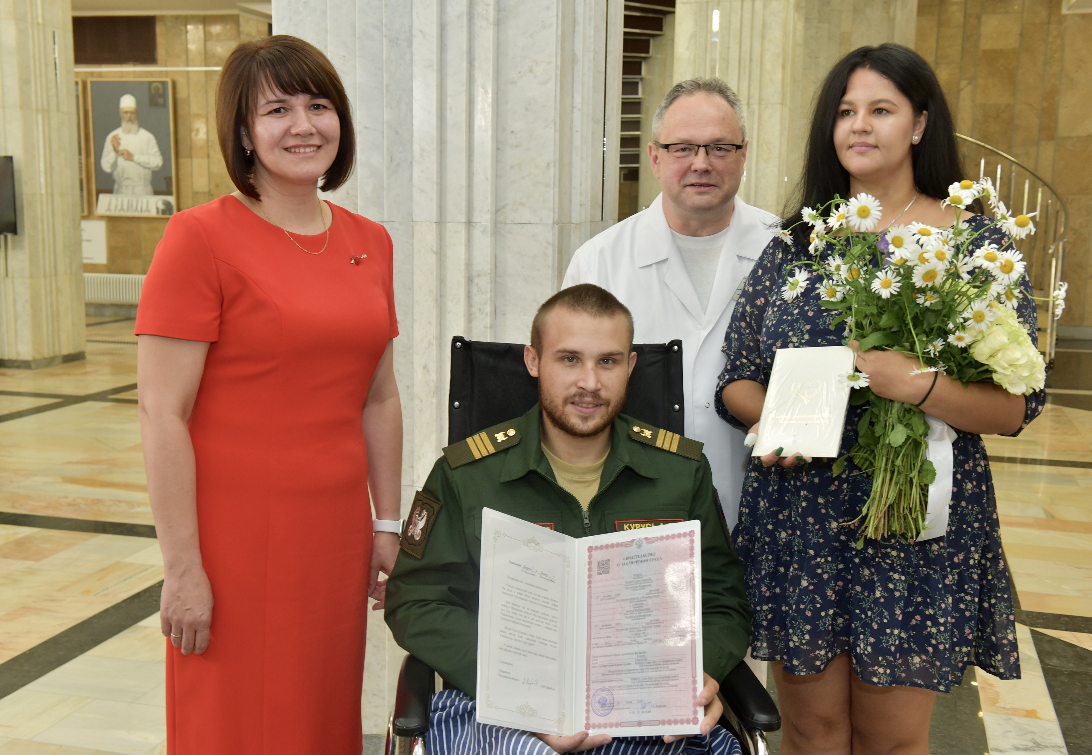 В НМИЦ ВМТ имени А.А. Вишневского впервые состоялась торжественная церемония бракосочетания. Военнослужащий – участник спецоперации по защите Луганской и Донецкой областей, находящийся в госпитале на излечении и медицинской реабилитации, создал семью не дожидаясь выписки из учреждения. Военная форма заменила свадебный фрак, а фойе главного корпуса – ЗАГС.