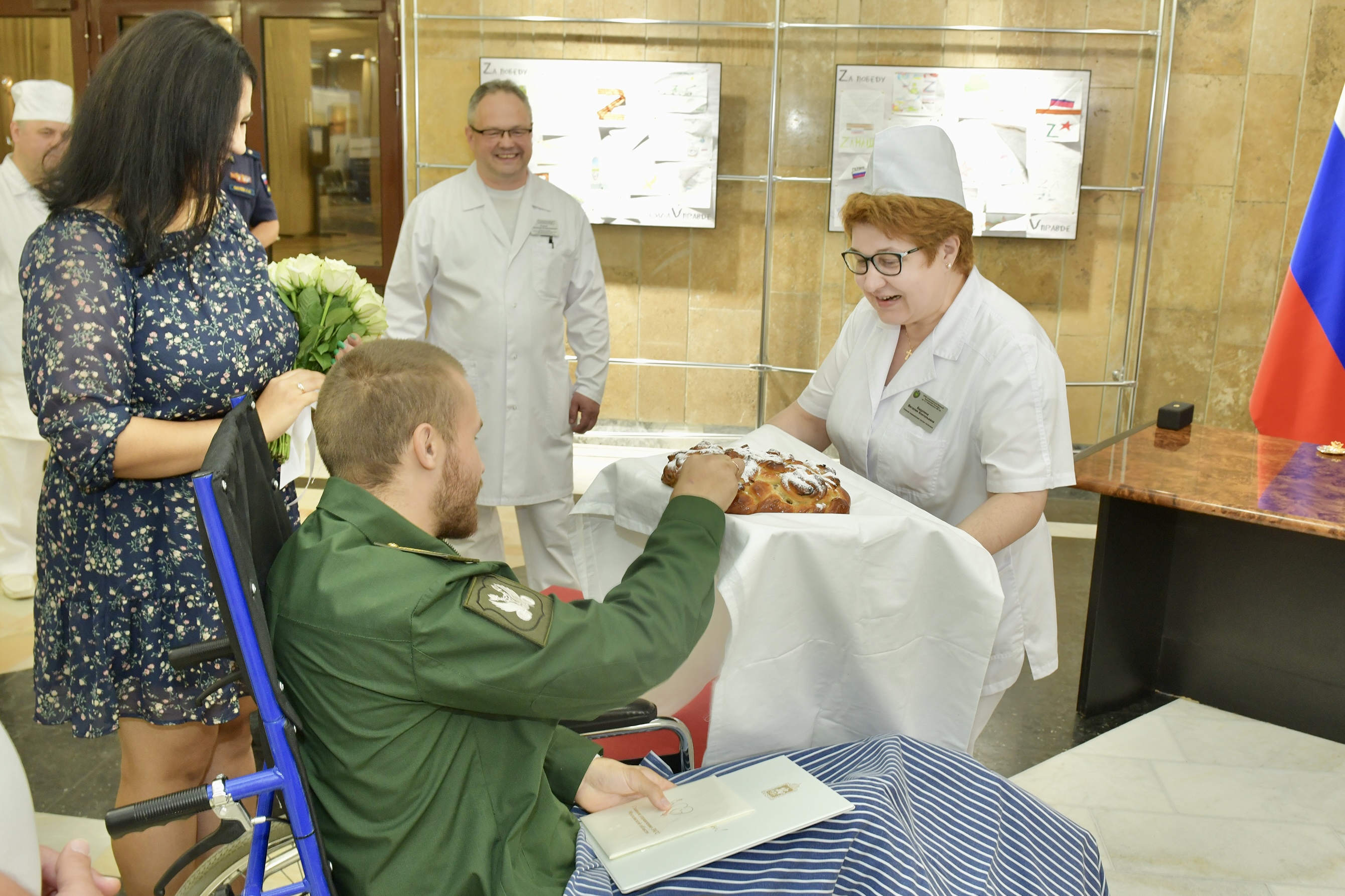 В свидетелях события у ребят был звёздный состав: лечащий врач жениха – хирург, заведующий отделением, кандидат медицинских наук, доцент, заслуженный врач России Амиран Хабурзания; со стороны невесты – заслуженный мастер спорта Анастасия Гнеденкова, которая год назад вместе с врачами этого же отделения боролась за жизнь своего возлюбленного. С традиционным караваем молодожёнов встречала главная медицинская сестра госпиталя Виталия Барулина, которая в этот день отметила свой юбилейный день рождения.