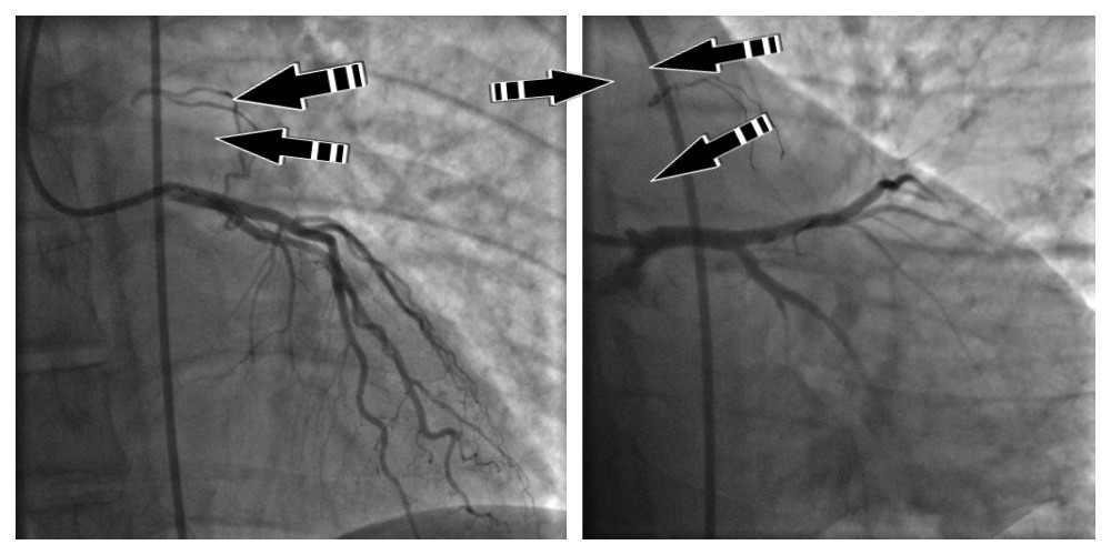 Эндоваскулярная процедура окклюзии корнаро-легочной фистулы выполняется под местной анестезией путем пункции бедренной артерии и катетеризации коронарной ветви. В представленном наблюдении коронаро-легочная фистула находилась в левом коронарном бассейне, поэтому катетеризовался ствол левой коронарной артерии. Выполнялась коронарография, определялся патологический афферент в проксимальной трети ПМЖВ на протяжении 15 см и диаметром не более 1.5 мм (с делением на два ствола в средней трети) и с незначительным венозным сбросом в легочный ствол. С помощью микропроводников и микрокатетера поочередно селективно катетеризированы афференты с последующей эмболизацией микроспиралями. Осложнений в данной манипуляции не наблюдалось. На контрольной коронарограмме достигнута полная эмболизация целевых артерий. По окончании исследования катетер удален с последующим гемостазом зоны пункции и наложением асептической давящей повязки на бедренную артерию.