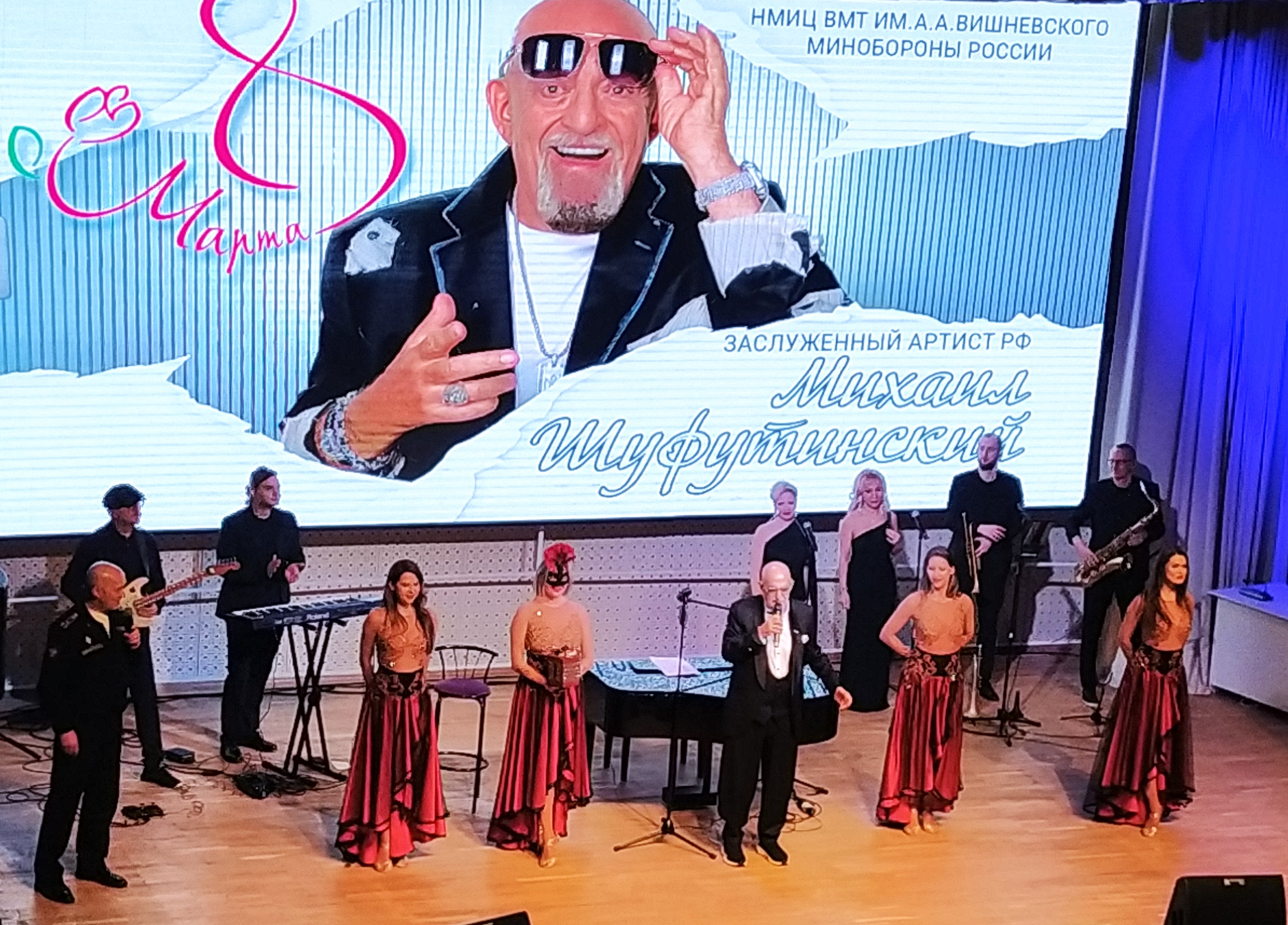 На сцене клуба НМИЦ ВМТ имени А.А. Вишневского состоялось творческое выступление для проходящих лечение раненых участников СВО и медперсонала госпиталя заслуженного артиста Российской Федерации Михаила Шуфутинского вместе с шоу-группой «Атаман-бэнд».