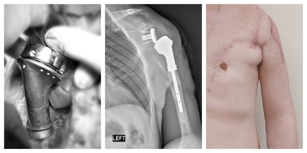 Когда мы заживили рану, встал вопрос установки: какой протез выбрать, как к этому процессу подойти. Конечно, начали мы всё это не с нуля, определённый опыт у нас уже был. Однако применение стандартных протезов плечевого сустава у данного пациента было невозможно из-за большого дефицита костной и мышечной ткани. Мы поняли, что надо использовать макет имеющихся онкологических протезов, замещающих практически всю кость, но ставить их с философией травматологии.
