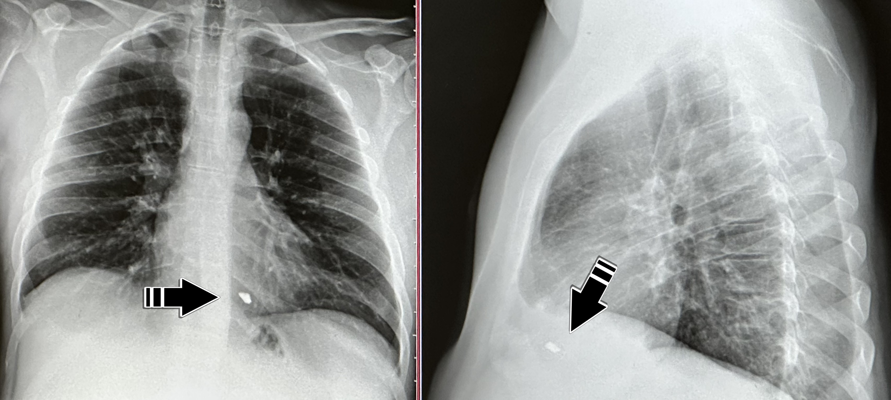 На снимке отчетливо видно светлую точку. Это осколок, который находится в правом желудочке