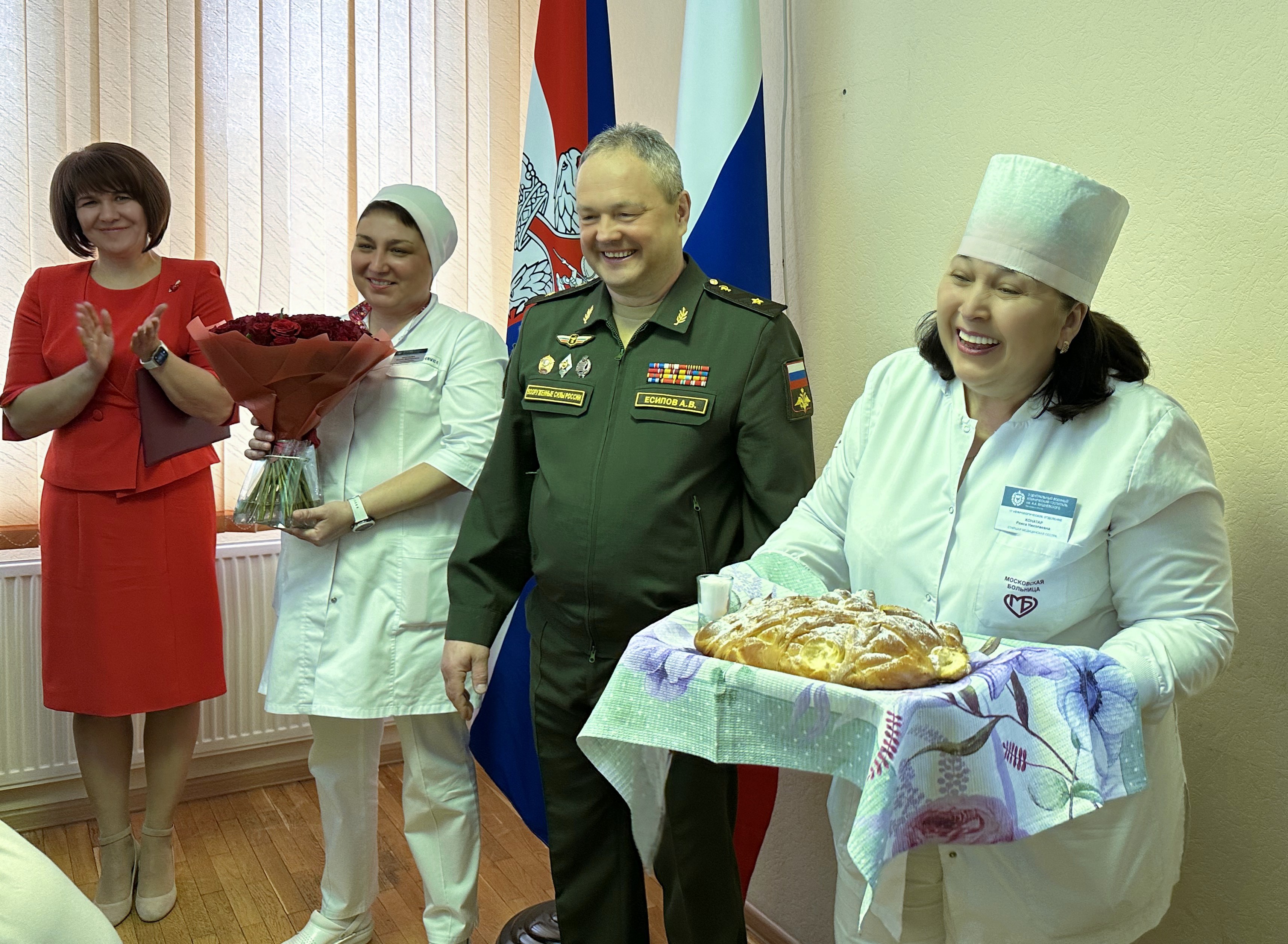 Поздравить молодоженов от имени командования госпиталя, Главного военно-медицинского управления и лично Министра обороны Российской Федерации Сергея Кужугетовича Шойгу пришел начальник НМИЦ ВМТ им. А. А. Вишневского генерал–майор Александр Владимирович Есипов:
