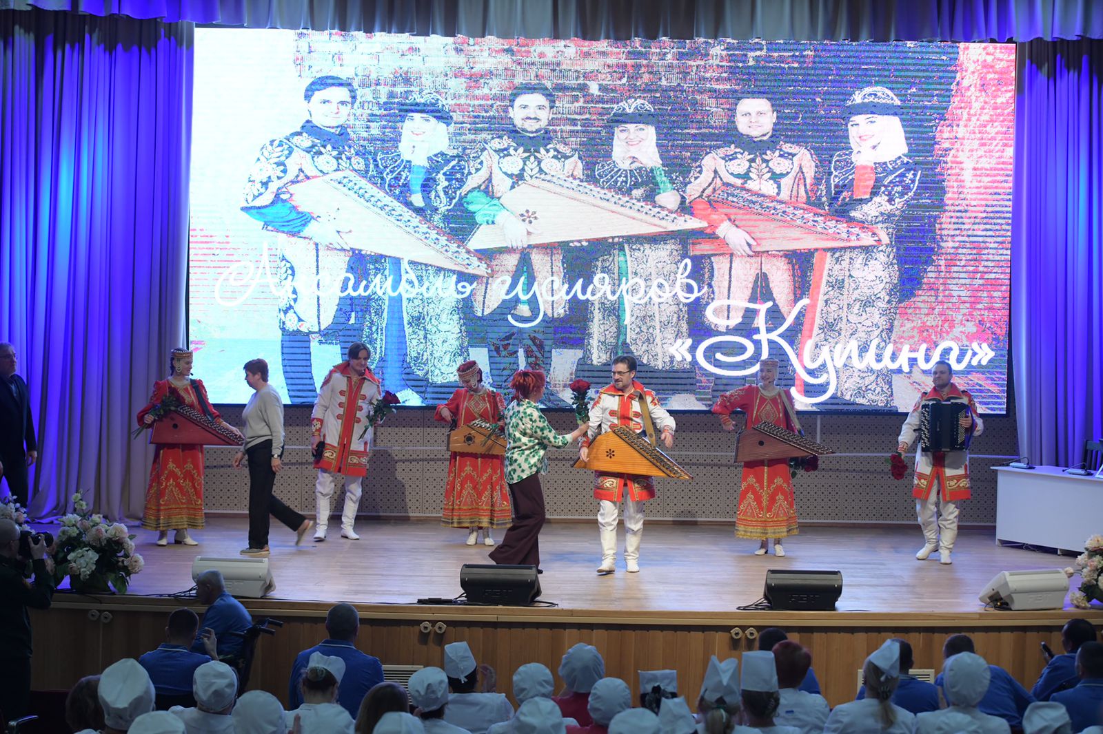 Вокалисты ансамбля: Александр Зыков, Альбина Старшинова, Анастасия Ермолаева, Дмитрий Кукушкин и Елизавета Мельниченко, уверенно овладели сценой, придавая каждому выступлению индивидуальность и эмоциональную насыщенность. Их голоса, сопоставимые по силе и красоте, создавали гармоничное звучание, дополняемое виртуозной игрой на гуслях и баяне. Концерт стал не только музыкальным событием, но и важной частью моральной поддержки для военнослужащих и медиков, которые играют ключевую роль в защите здоровья и безопасности граждан.
