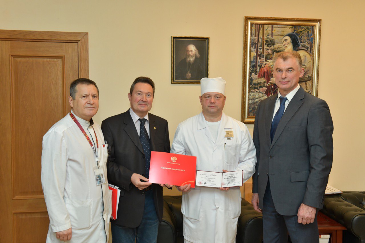 Диплом действительного члена Академии военных наук под номером 1757 начальнику госпиталя имени А.А. Вишневского, доктору медицинских наук, профессору, заслуженному врачу РФ, генерал-майору медицинской службы Александру Владимировичу Есипову в торжественной обстановке вручил член президиума АВН, доктор экономических наук, профессор, заслуженный энергетик РФ Николай Николаевич Швец.