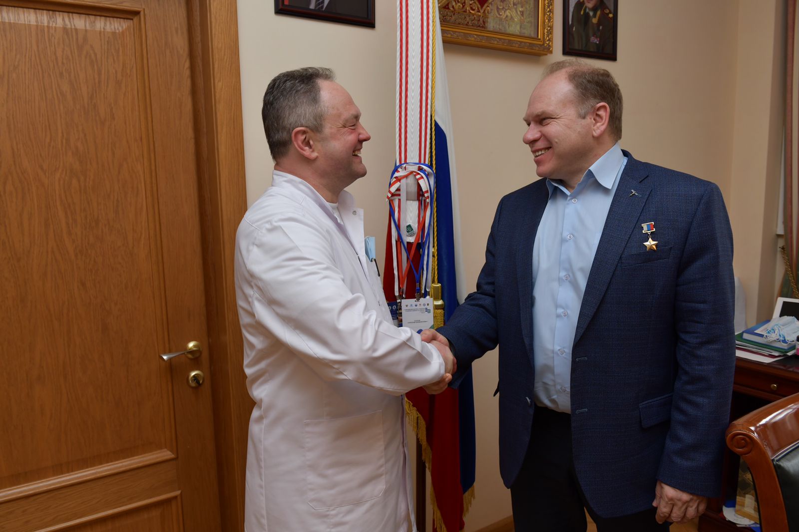 Заместитель директора по науке Института медико-биологических проблем Российской академии наук, кандидат медицинских наук Олег Валериевич Котов и начальник НМИЦ ВМТ - ЦВКГ им. А.А. Вишневского МО РФ, доктор медицинских наук, Заслуженный врач РФ Александр Владимирович Есипов переговорили о взаимодействии двух Центров по ряду научных направлений, об их участии в совместных конференциях и обмене опытом.