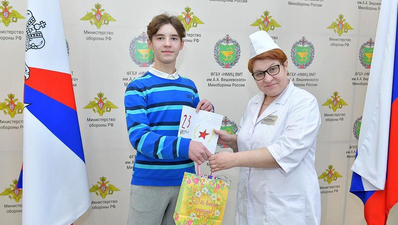 Представители Федерального фонда Обязательного медицинского страхования поздравили с Днем защитника Отечества медиков и военнослужащих, проходящих лечение в НМИЦ ВМТ им. А. А. Вишневского МО РФ.