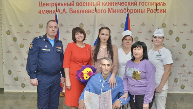 В стенах НМИЦ ВМТ имени А. А. Вишневского вновь прозвучал марш Мендельсона. Участник СВО, находящийся на излечении в госпитале, сделал предложение своей любимой женщине – матери его детей. Сотрудники отдела ЗАГС по городскому округу Истра главного управления ЗАГС Московской области провели торжественную церемонию бракосочетания прямо на территории военного медицинского учреждения и тем самым узаконили право жены ухаживать за раненым мужем.